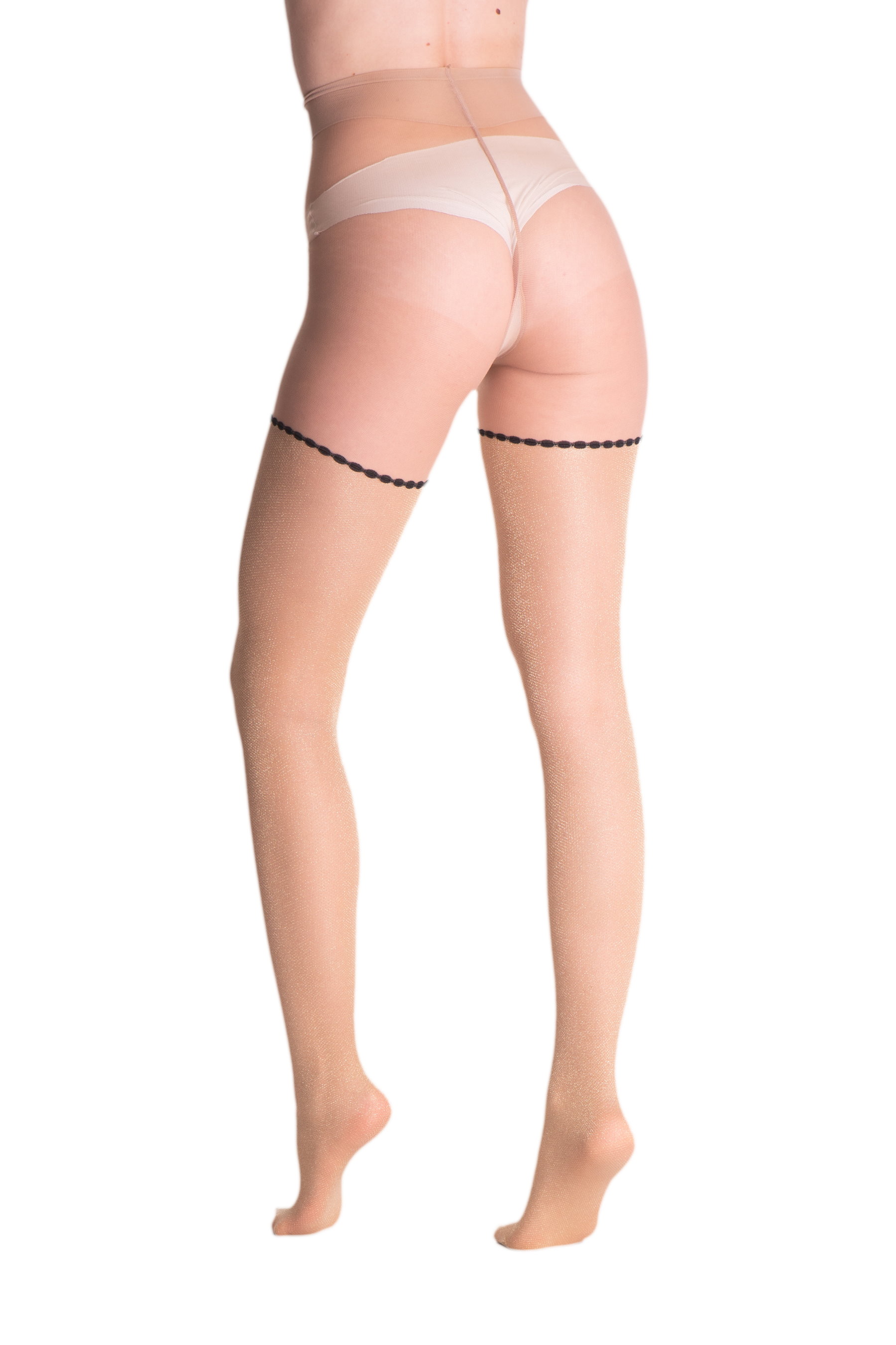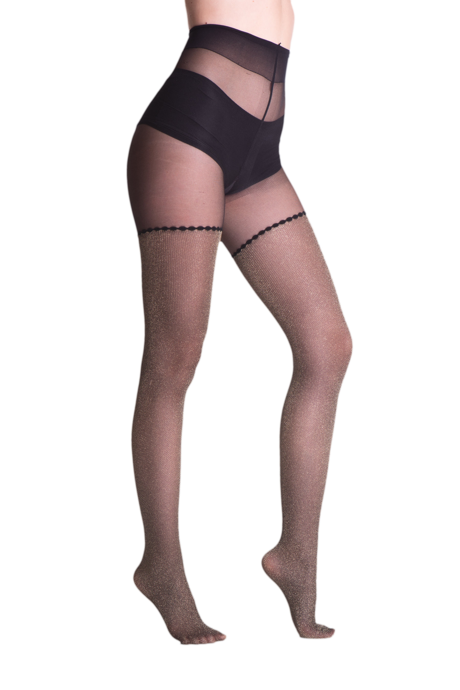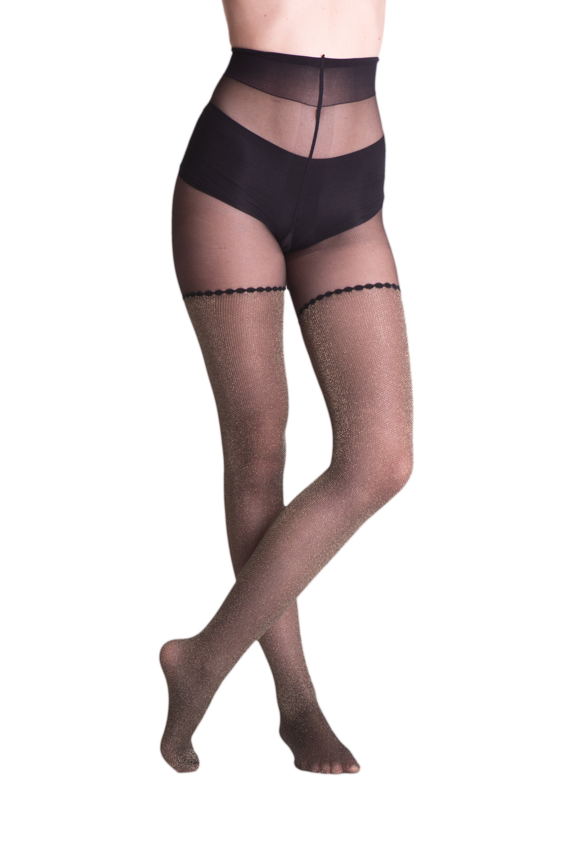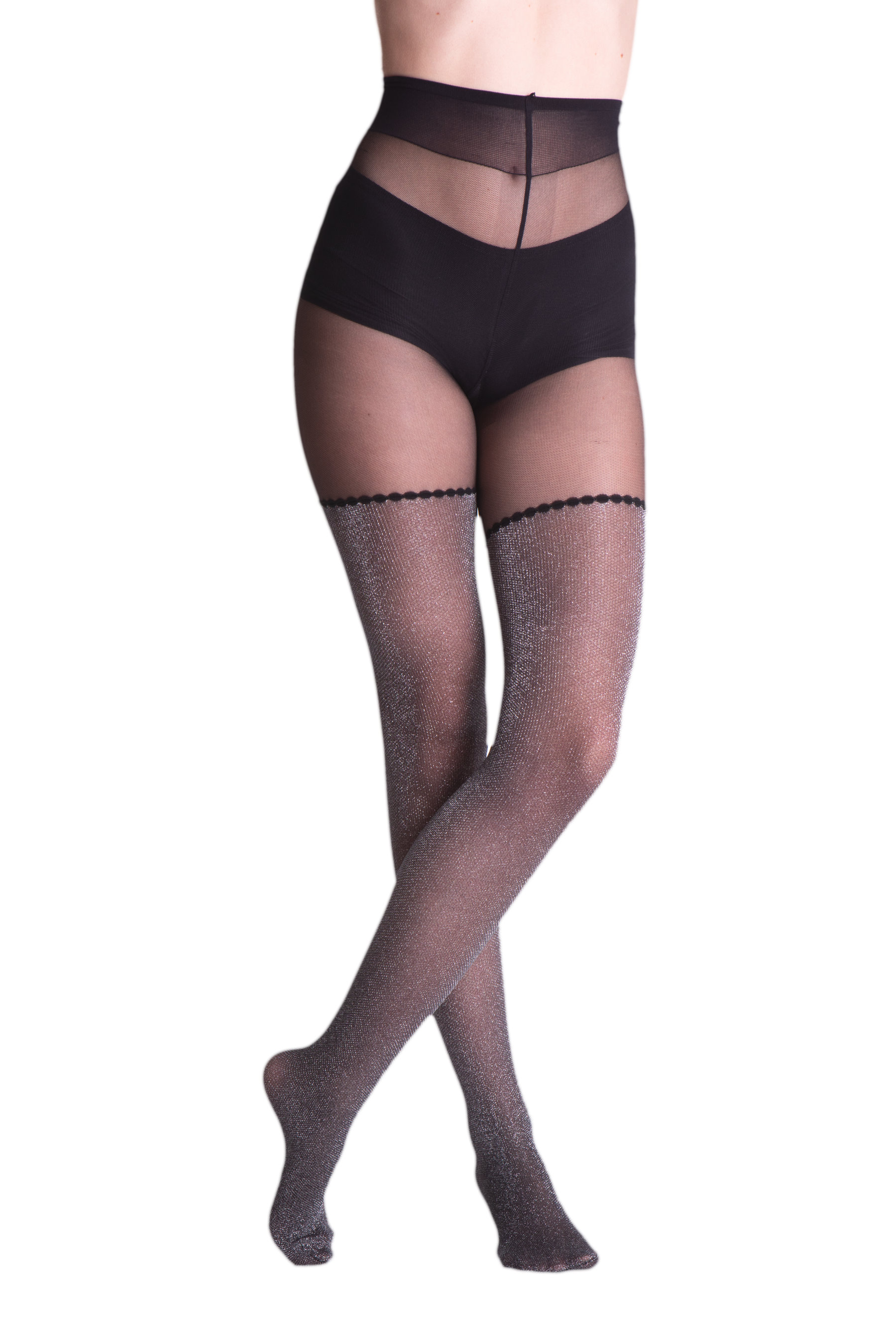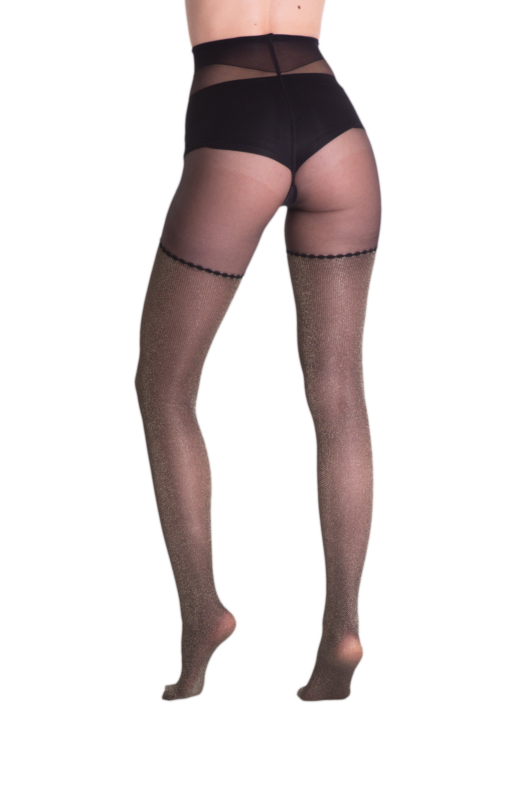 Semi-heltäckande, glansig strumpbyxa med lurex-effect och stay ups-look. 40 denier
